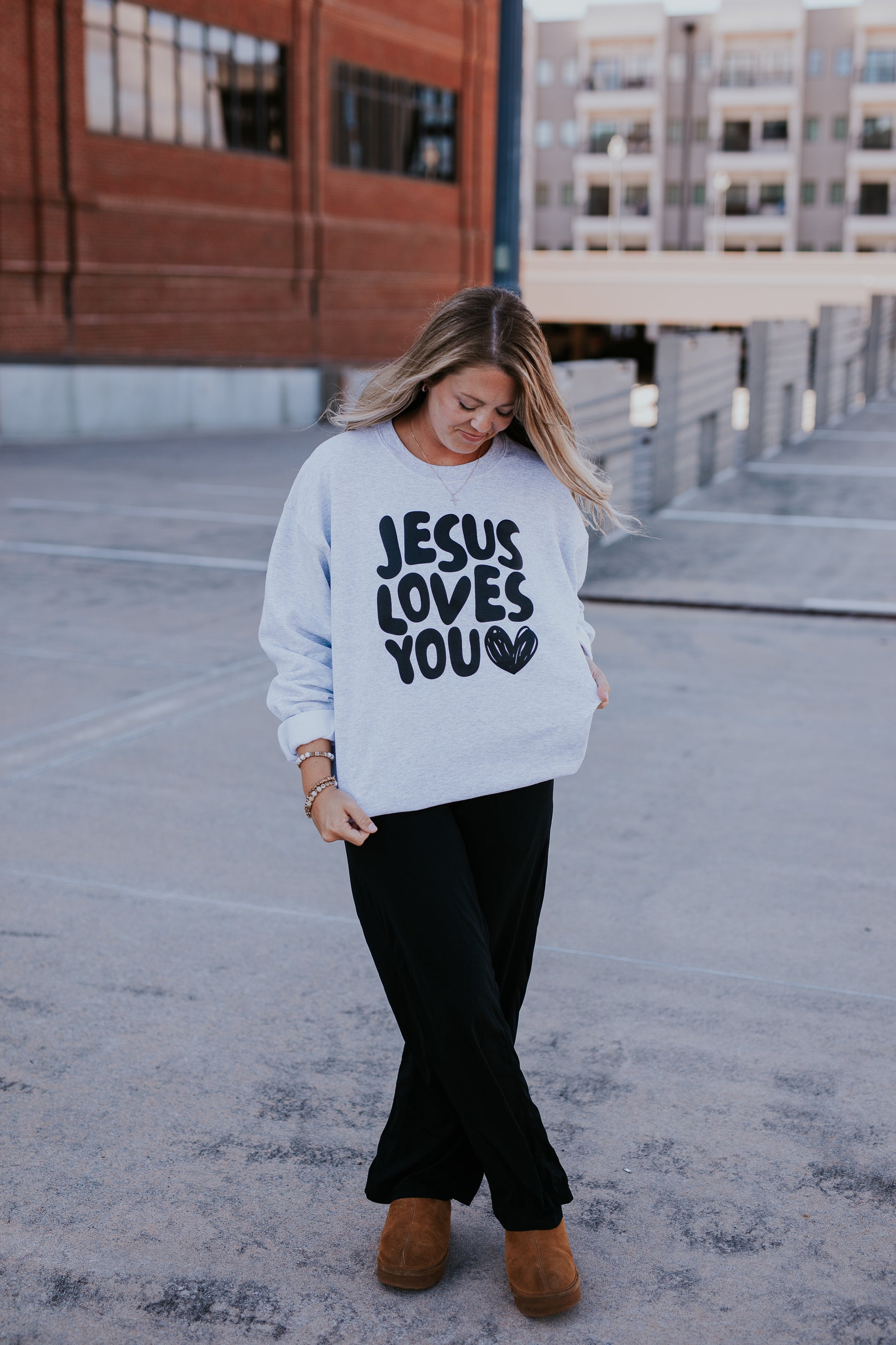 Whether you’re lounging at home, heading to church, or out on a coffee run, this sweatshirt is a cozy way to share the message that never goes out of style — Jesus loves you.